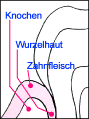 Zahnfleisch und Zahn vorzudringen und dort eine Entzündung zu verursachen, die bald auf das Zahnfleisch